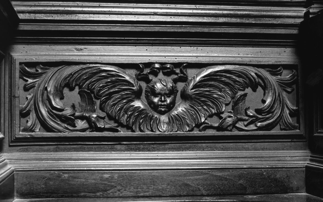 Al centro del pannello il volto di un angioletto da cui prendono origine ampie ali. Le piume terminali generano lo stelo di un giglio. Due roselline contribuiscono ad incorniciare il volto dell'angioletto
