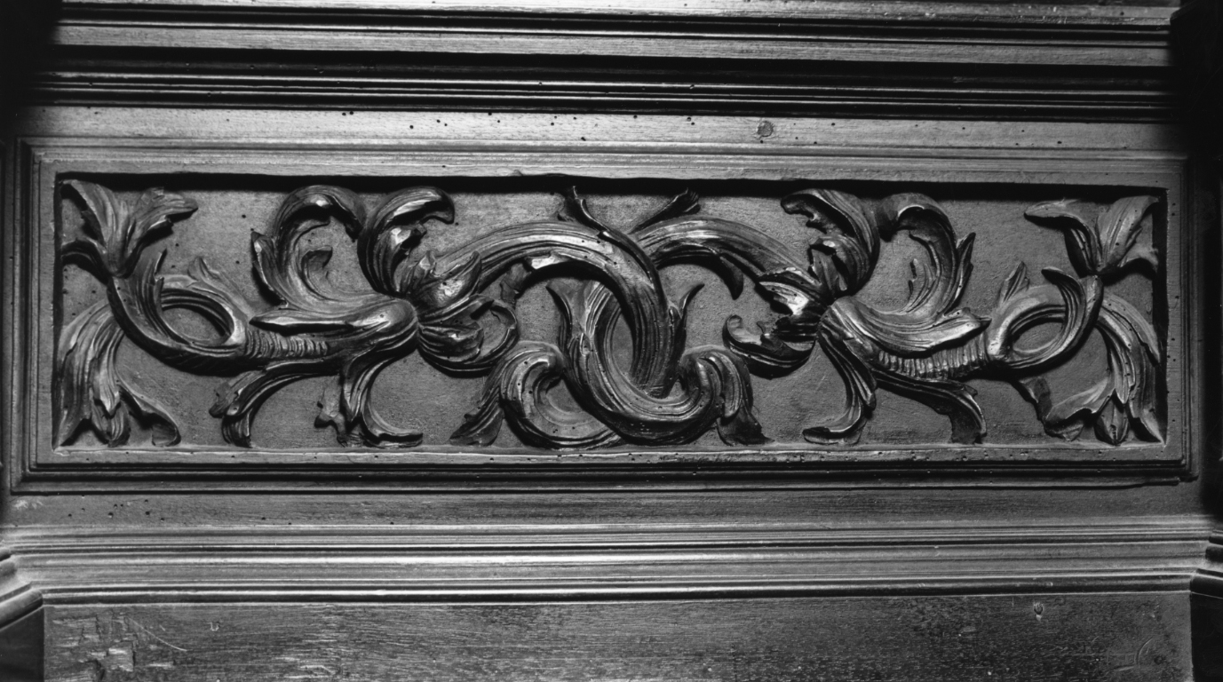Due volute fitomorfe si intersecano al centro del pannello e si sviluppano con foglie accartocciate fino a dar luogo a fiori, forse gigli, alle estremità del pannello