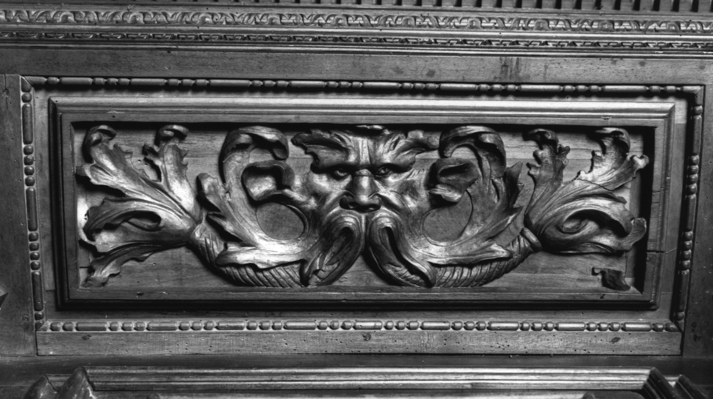 Al centro mascherone accigliato i cui baffi sono costituiti da motivi fitomorfi che diramandosi in due volute opposte e simmetriche formano, accartocciandosi, le orecchie e, distendendosi verso i lati estremi, dei fiori polilobati, forse gigli