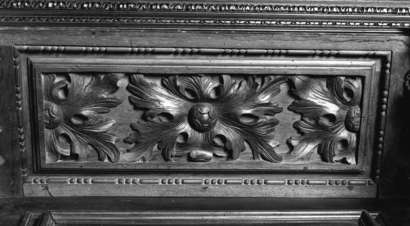 Fiore centrale con androceo inciso a stella; ai lati composizione di foglie