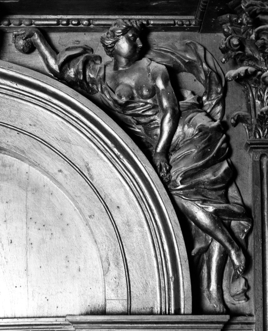 Scultura a mezzorilievo. Figura con mano sinistra appoggiata all'estradosso dell'arco; volto rivolto a destra; avvolta da veste drappeggiata; un lembo svolazzante; spalle e seno scoperto; un frutto (?) nella mano destra; forse una Sibilla