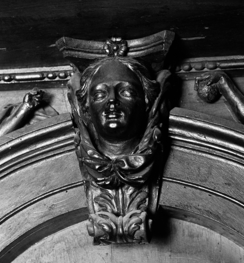 Volto femminile incorniciato da un panno; sostiene abaco di capitello con al centro un fiore; nella parte inferiore si sviluppa una voluta rivolta all'esterno decorata da motivi fitomorfi