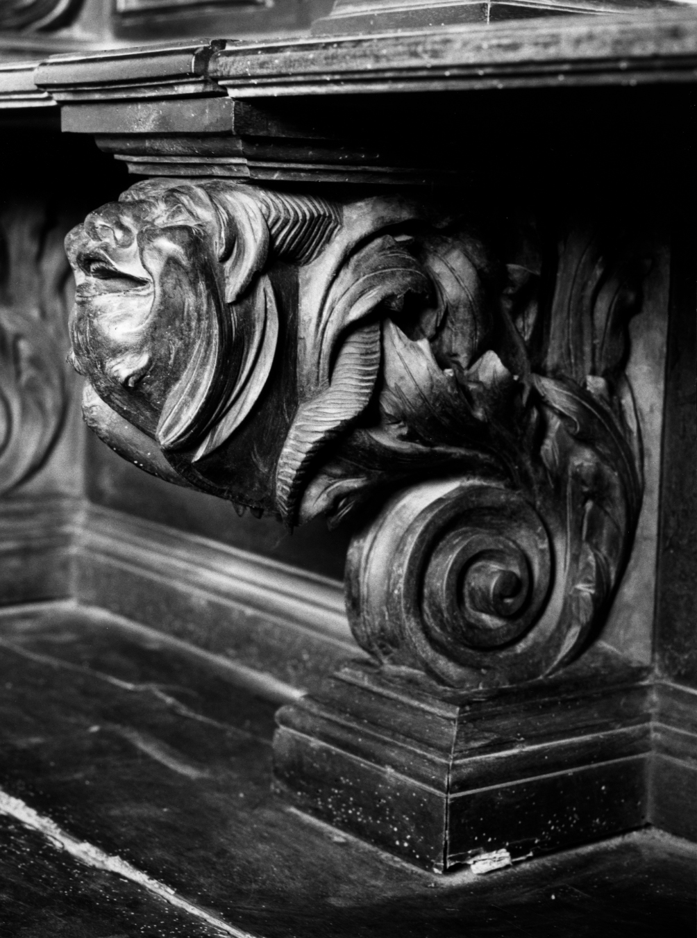 Mascherone sorridente; bocca aperta che lascia intravedere i denti; guance pronunciate; grandi occhi e mento prominente, corna laterali; piede a voluta con decorazioni fitomorfe