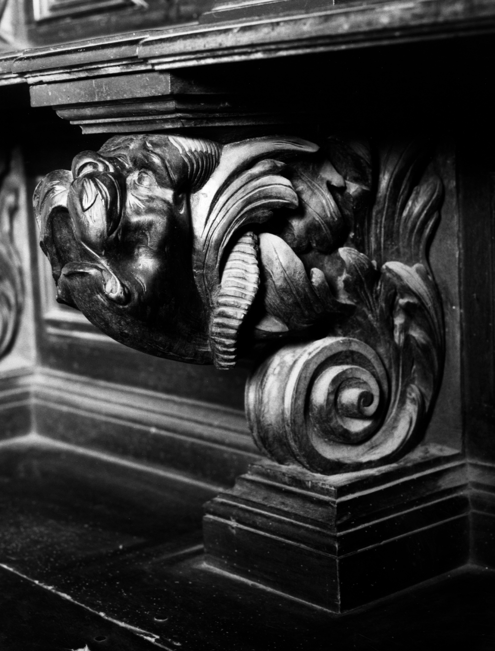 Mascherone zoomorfo; naso pronunciato; baffi; labbro inferiore redente; corna laterali; piede a voluta con decorazione fitomorfa