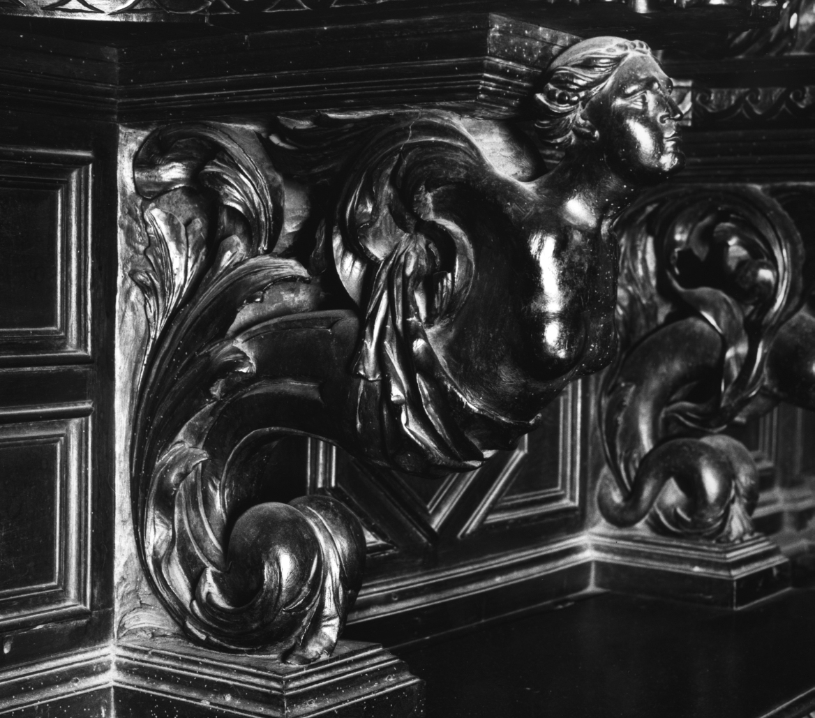 Figura femminile; fra i capelli una corona di perle; torso ignudo; fianchi coperti da un drappo; il piede termina con voluta fitomorfa