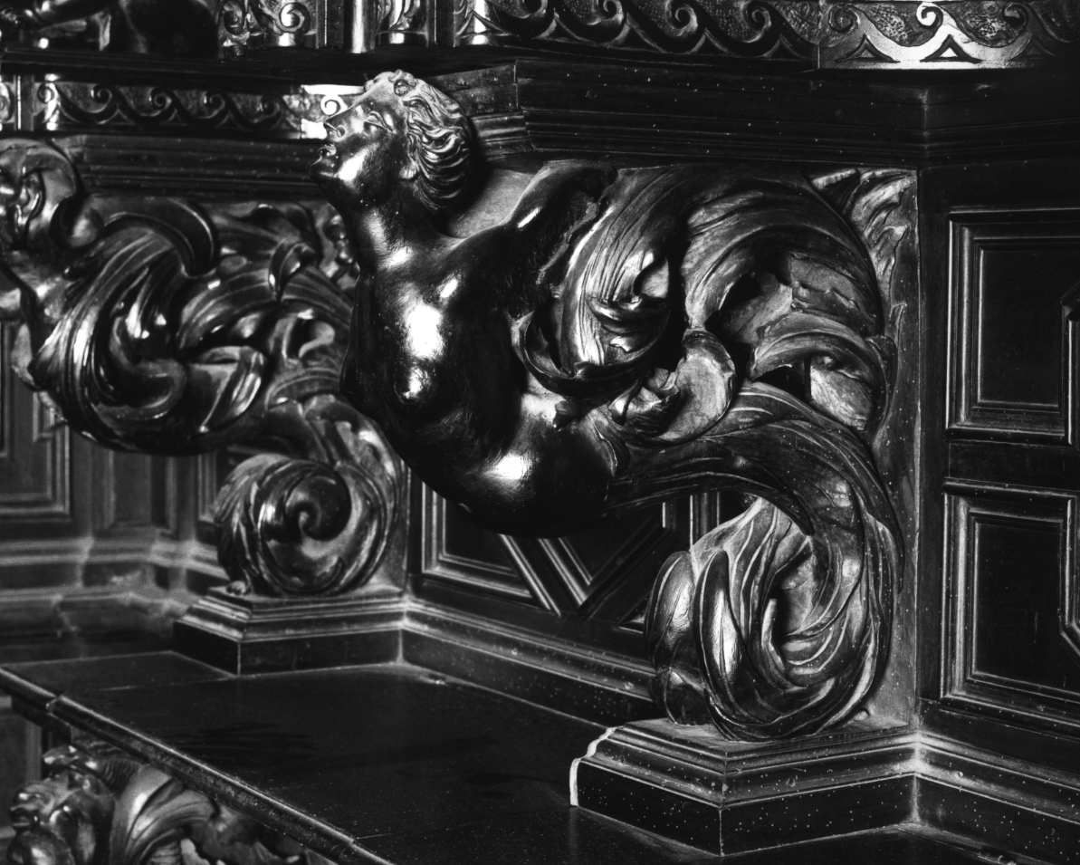 Busto ignudo, ali spiegate al posto delle braccia; volute vegetali lungo il corpo; parte terminale a coda ritorta