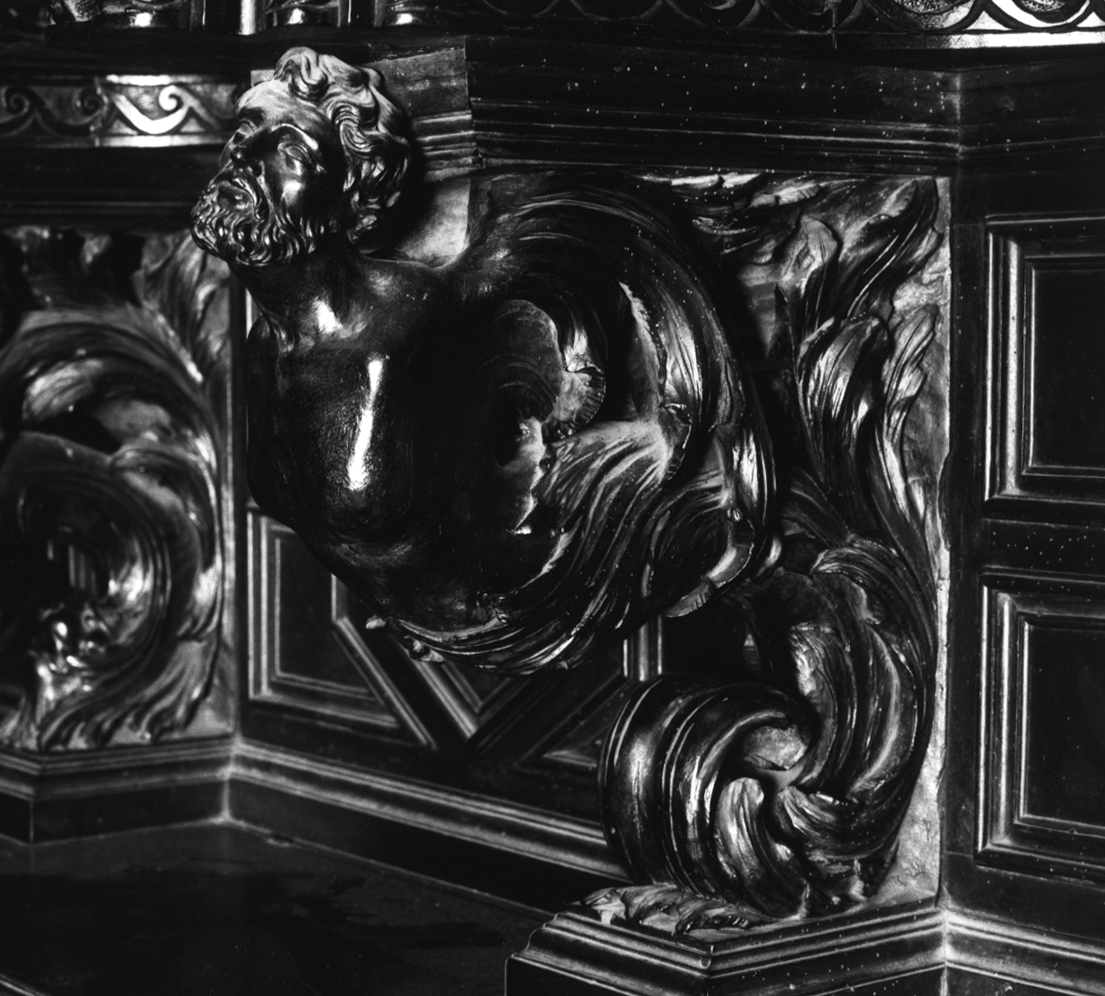 Figura maschile con barba; torso ignudo; ali al posto delle braccia; il piede forma decorazioni fitomorfe