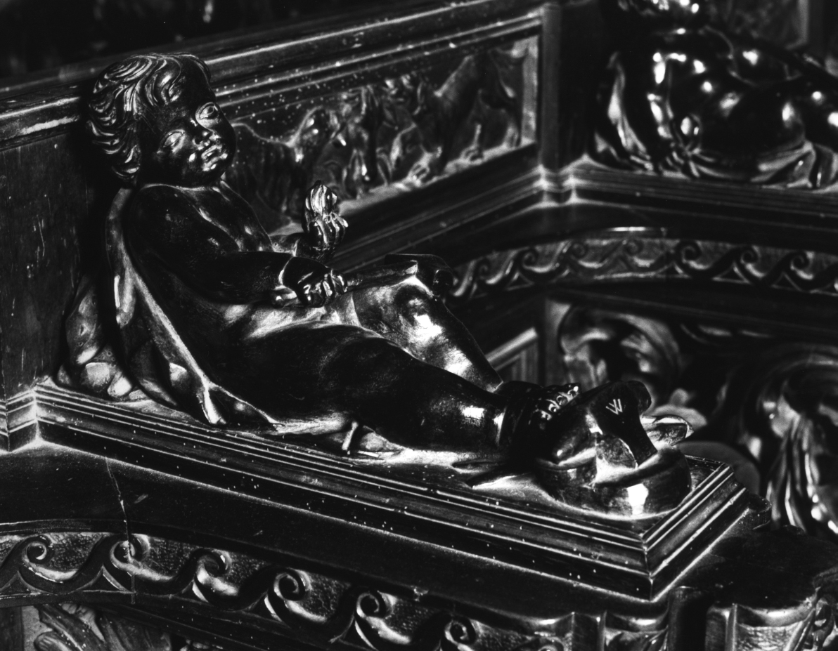 Putto semisdraiato, ignudo con drappo alle spalle; fiamme nella mano sinistra e martello nella destra; ai piedi su base circolare incudine, tenaglia, mantice, possibile rappresentazione della Metallurgia NSC: Sull'incudine incisa la lettera W: l'iscrizione ricorre identica, accompagnata da una D, in altre parti del coro e si suppone sia la sigla dell'autore