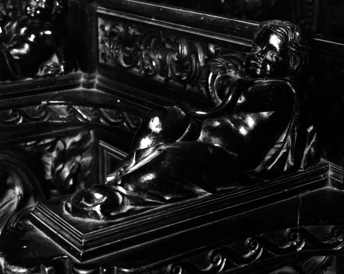 Putto semisdraiato; ignudo con drappo sulla gamba destra e tracolla; serpente tra le mani e attorno al braccio; possibile rappresentazione della Prudenza