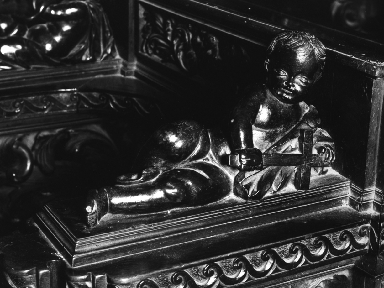 Putto sdraiato su fianco; ignudo con drappo; croce tra le mani; possibile rappresentazione della Fede cristiana