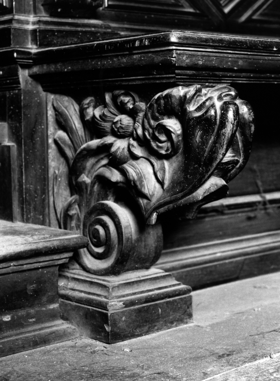 Grottesca: bocca spalancata, sopraccigli e baffi enfatizzati, corni ritorti sul capo; parte terminale: coda ritorta; decorazione fitomorfa: volute vegetali, due corolle di fiori