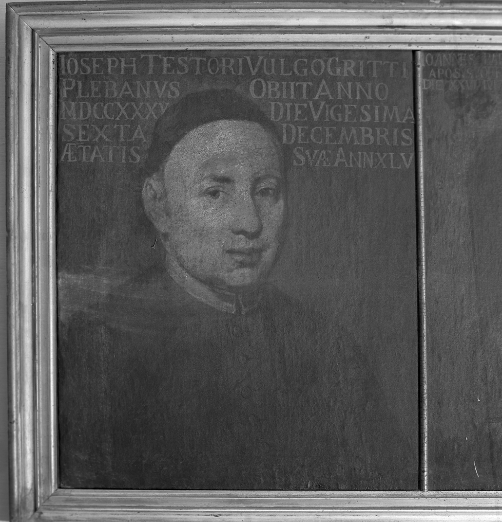- ISCRIZIONI IOSEPH TESTORI VULGO GRITTI/ PLEBANUS OBIIT ANNO MDCCXXXV DIE VIGESIMA SEXTA DECEMBRIS AETATIS SUAE ANN XLV - lettere capitali - a pennello - latino