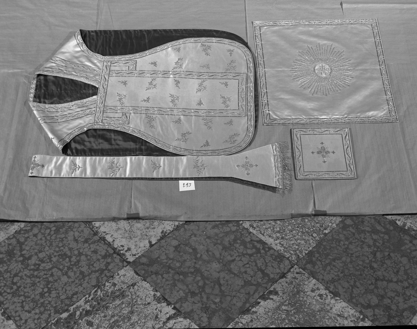 Paramento liturgico composto da quattro pezzi. Motivo decorativo a teorie verticali