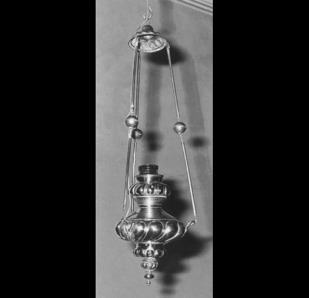 Puntale: a fusione. Corpo: formato da tre fascie sovrapposte caratterizzate da bacellature a vescica di pesce. Imbocco: liscio: catene: a cannuccia intervallate da sferette. Piatello: rialato con bacellature. Manici: figurati