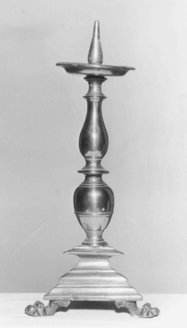 Piede: a base triangolare modanato su tre piedini a zampa di leone; nodo: ovoidale; balaustro