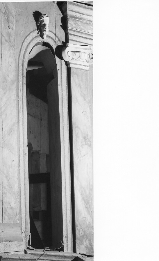 Mostra centinata dipinta a finta modanatura con mascherone in chiave d'arco