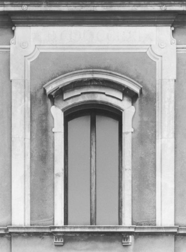 Mostra ad arco, con stipiti e architrave lisci, cornice modanata aggettante