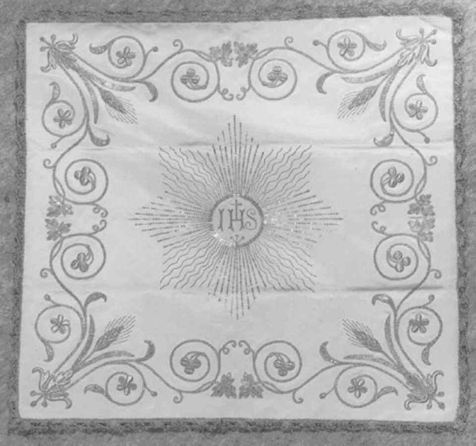 Tessuto: fondo bianco ricamato in oro filato riccio e lamellare; pailettes. Gallone: a fuselli in oro filato riccio e lamellare. Decorazione: monogramma cristologico