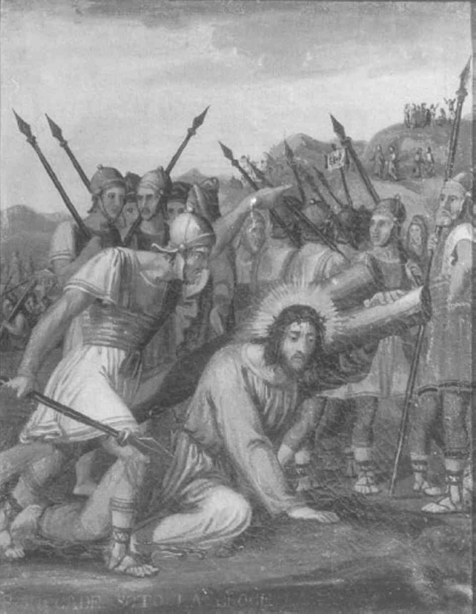 - ISCRIZIONI In basso - GESU CADE SOTO LA CROCE LA [...] - lettere capitali - a pennello - italiano volgare