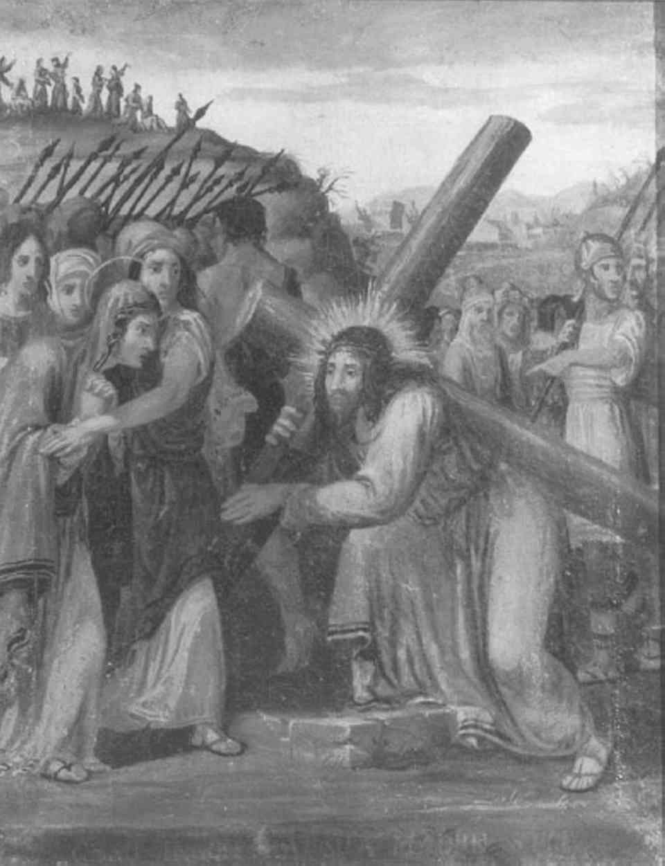 Personaggi: Cristo; Madonna. Figure: soldati; figure maschili; figure femminili. Oggetti: croce. Armi: lance