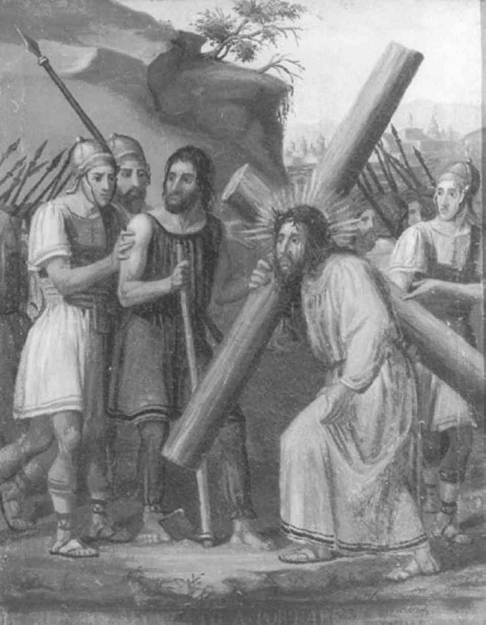 Personaggi: Cristo; Cireneo. Figure: soldati. Armi: lance. Oggetti: croce. Paesaggi: paesaggio con città