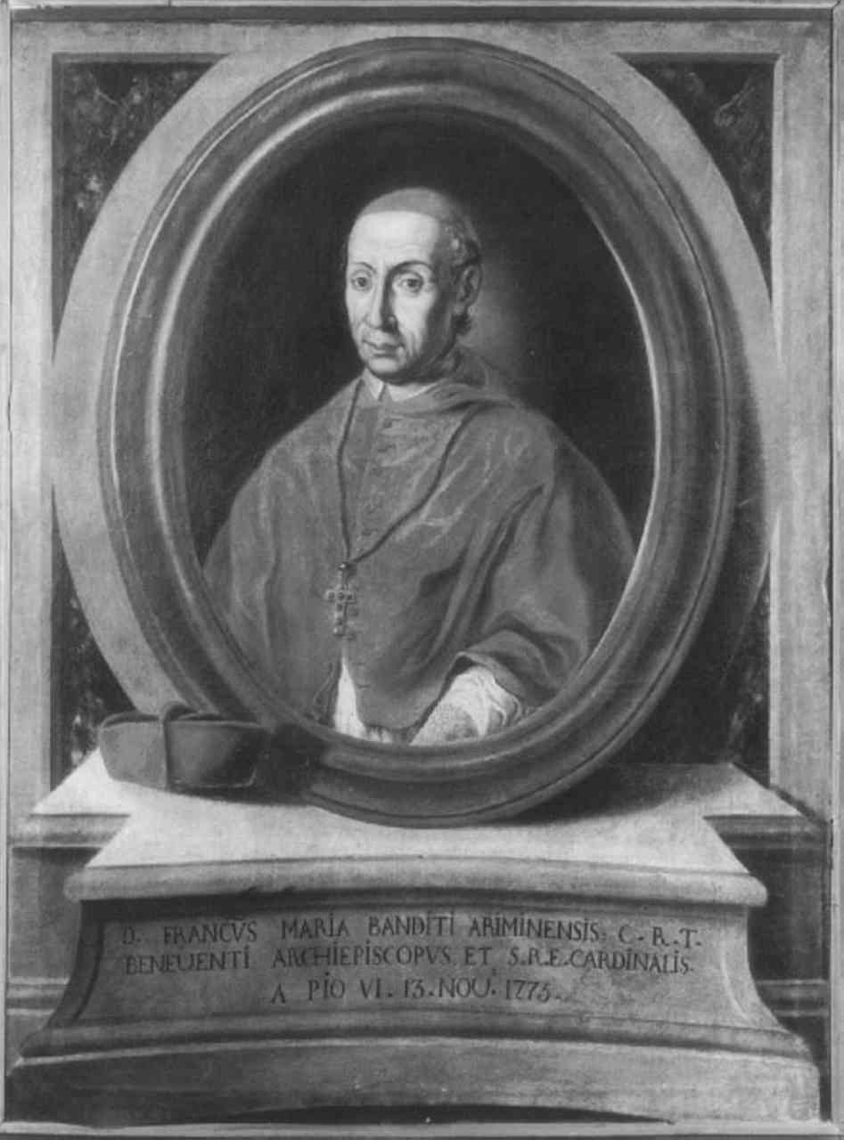 Personaggi: Francesco Maria Banditi Cardinale. Elementi architettonici: basamento. Abbigliamento: vesti cardinalizie. Decorazioni: cornice ovale