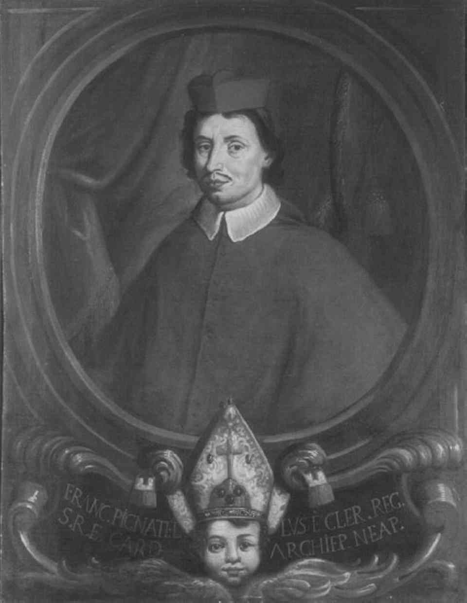 Personaggi: Francesco Pignatelli Cardinale. Abbigliamento religioso: vesti cardinalizie. Oggetti: cartiglio con iscrizione. Decorazioni: cornice ovale; testina angelica