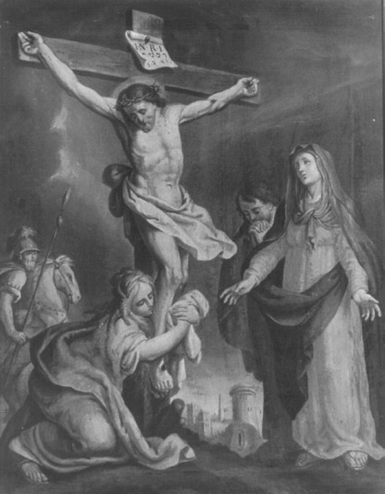Personaggi: Cristo; Madonna; Santa Maria Maddalena; San Giovanni Evangelista. Figure maschili: cavaliere. Architetture