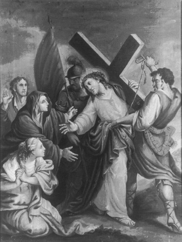 Personaggi: Gesù Cristo; Madonna. Figure femminili: donne. Figure maschili: soldato. Oggetti: croce; vessillo; corda