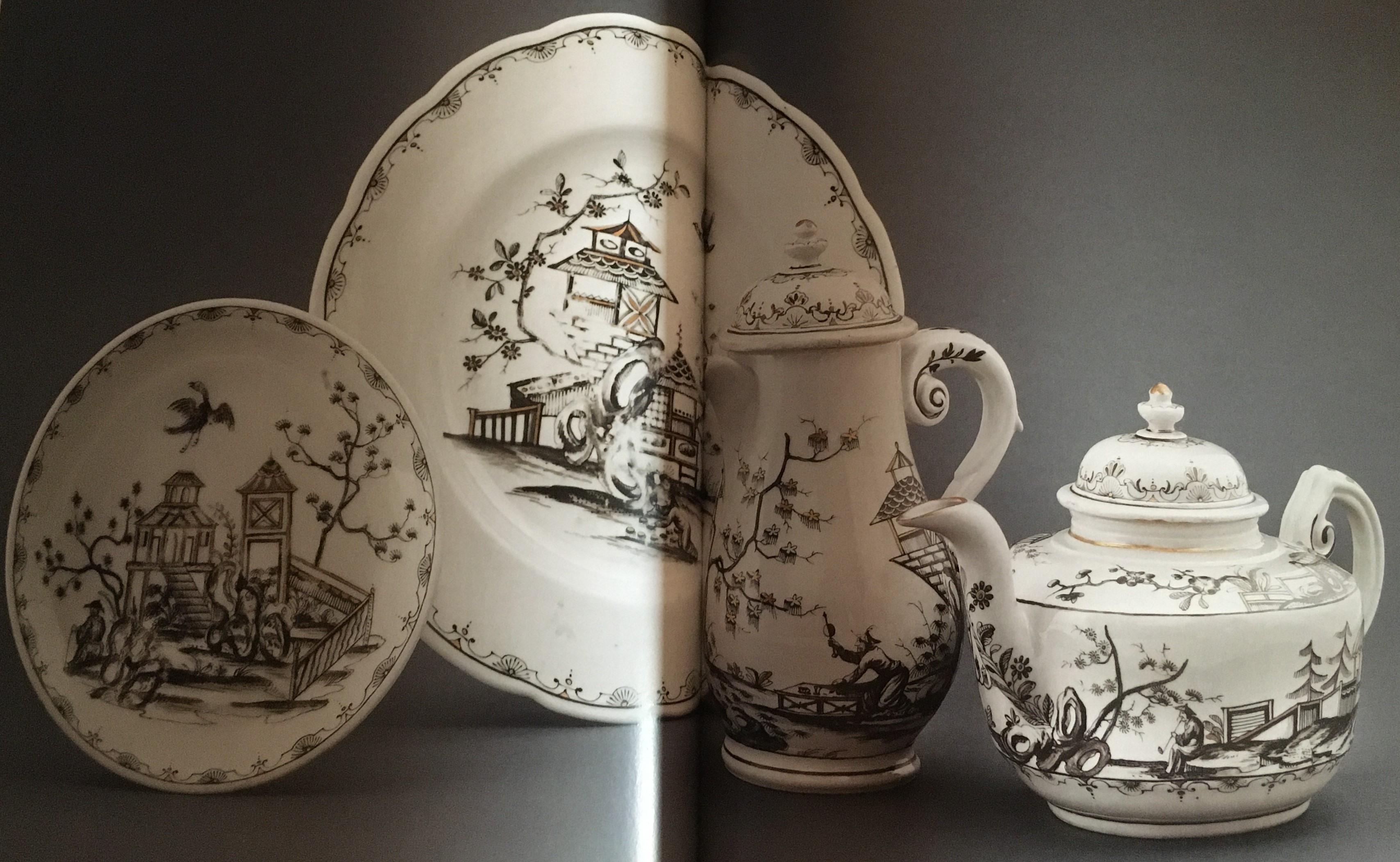 Servizio composto da: caffettiera, teiera, contenitore con coperchio, piatto con tesa centinata, quattro tazze a campana e due piattini. Coperchio assente nella caffettiera. La decorazione è in monocromia nera con lumeggiature dorate, in un paesaggio con giardini orientali si scorgono piccole figure cinesi e uccelli ad animarlo. Sul resto della superficie sono sparsi mazzetti di fiori e lungo i bordi corrono le cornici barocche "Laub und Bandelwerk" (fogliame e nastri intrecciati) a linee miste nere e puntini d'oro