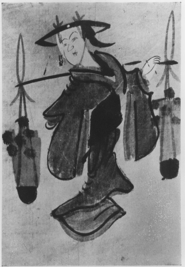 Pittura a colori, mostra una venditrice di fiori in tipico abito giapponese