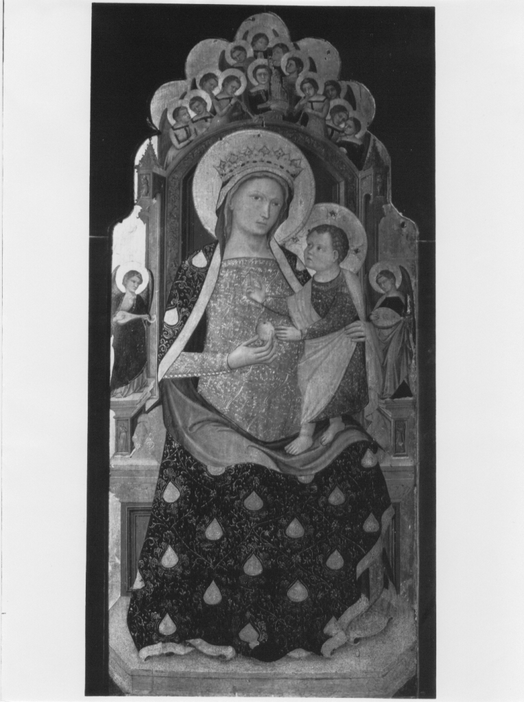 Tavola a sviluppo verticale sagomata nella parte superiore. In trono la Madonna con in braccio il Bambino che sta ritto in piedi sulla sua coscia. La Vergine porge una mela, mentre Gesù fa il segno della benedizione con la mano destra. Ai lati del trono architettonico, decorato con quattro figure intere scolpite e decorazioni fitomorfe sullo schienale, si trovano due angeli musicanti. Nella parte superiore del trono un consesso di tredici angeli musicanti