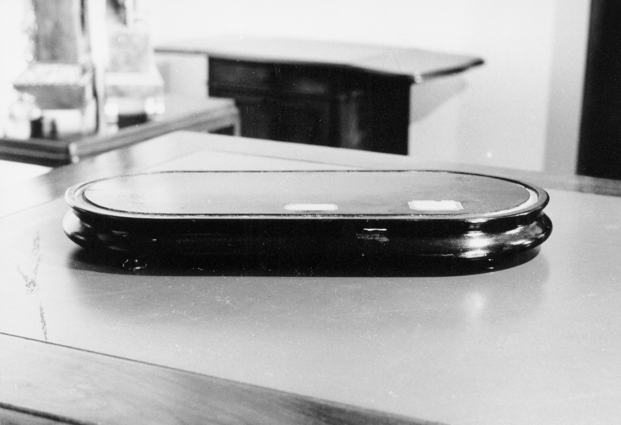 base per orologio di forma ovale allungata, in legno laccato nero con fascia incavata lungo il perimetro del piano