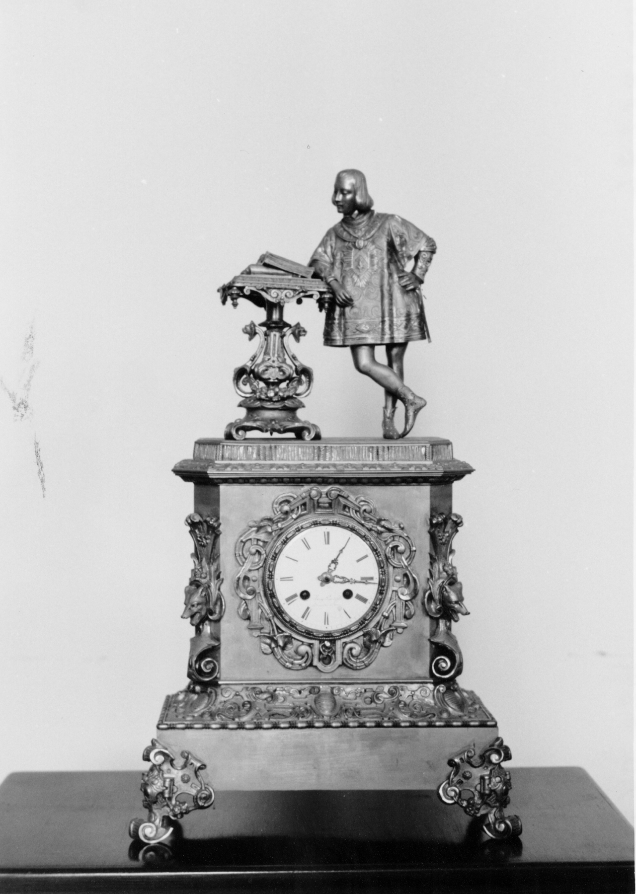 orologio in Stile Neorococò, rappresentante un gentiluomo che ha sulla veste uno stemma con giglio, poggia su un leggio sul quale è un libro aperto con la scritta "diei"