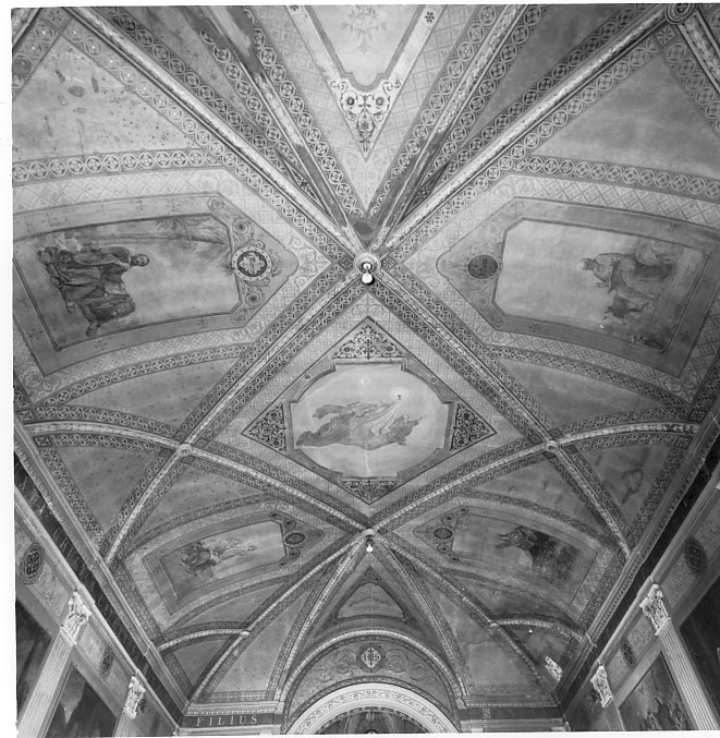 Soffitto decorato con motivi decorativi fitomorfici e geometrici, i quattro Evangelisti e le virtù Cardinali