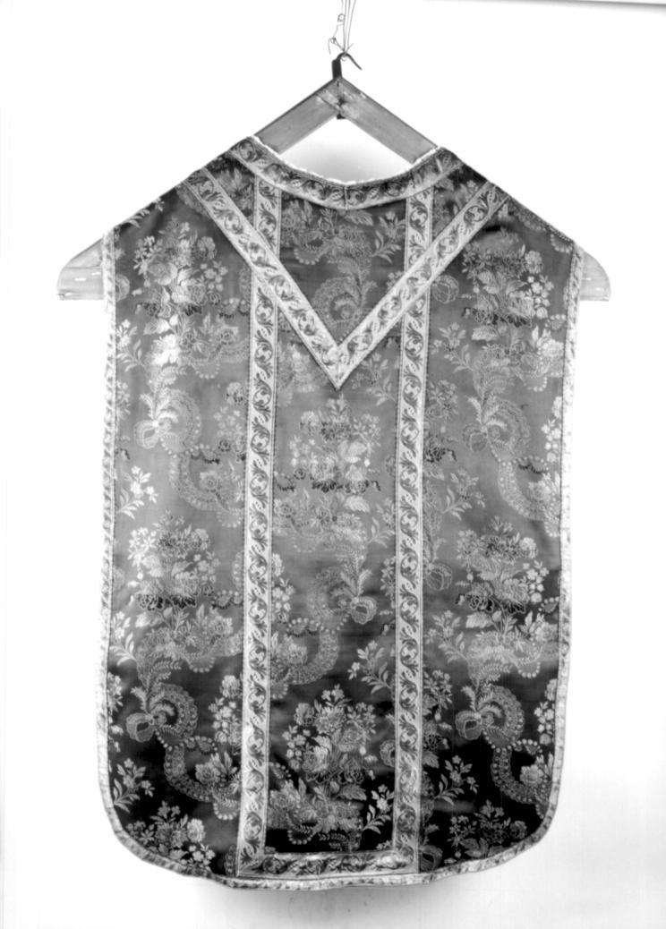 PIANETA VERDE CON RIPARTIZIONI E BORDI IN PASSAMANERIA. MOTIVI FLOREALI E FITOMORFI. MERLETTO DI COTONE BIANCO ALLO SCOLLO