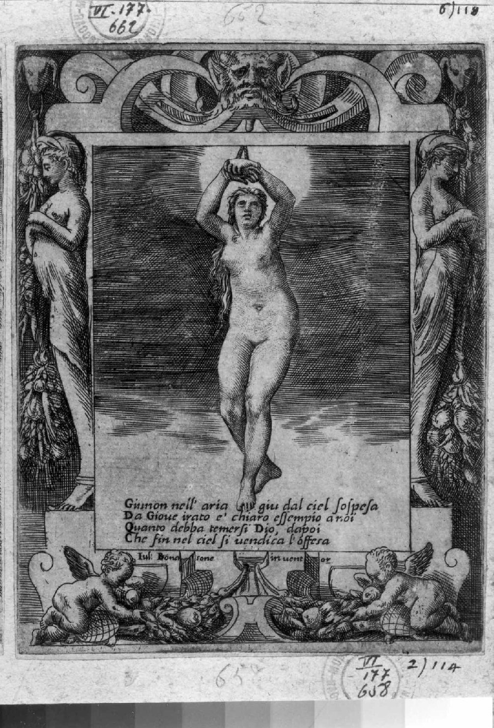 Personaggi: Giunone nuda: sospesa in aria legata per le mani. Decorazioni: cornice: cariatidi ai lati; ornato geometrico in alto: mascherone; in basso: due putti alati; festoni