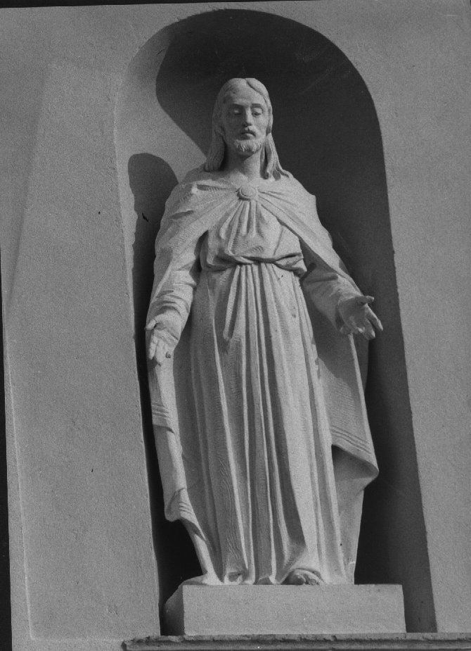 Statua raffigurante Cristo Salvatore con le braccia aperte e vestito di una tunica e di un manto