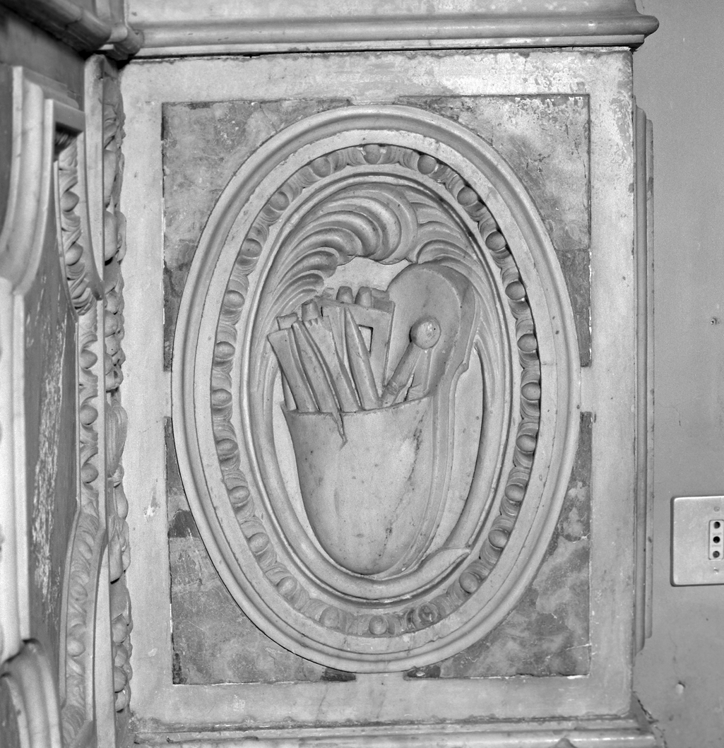 Rilievo entro cornice ovale con motivo decorativo con attrezzi da falegname entro palme