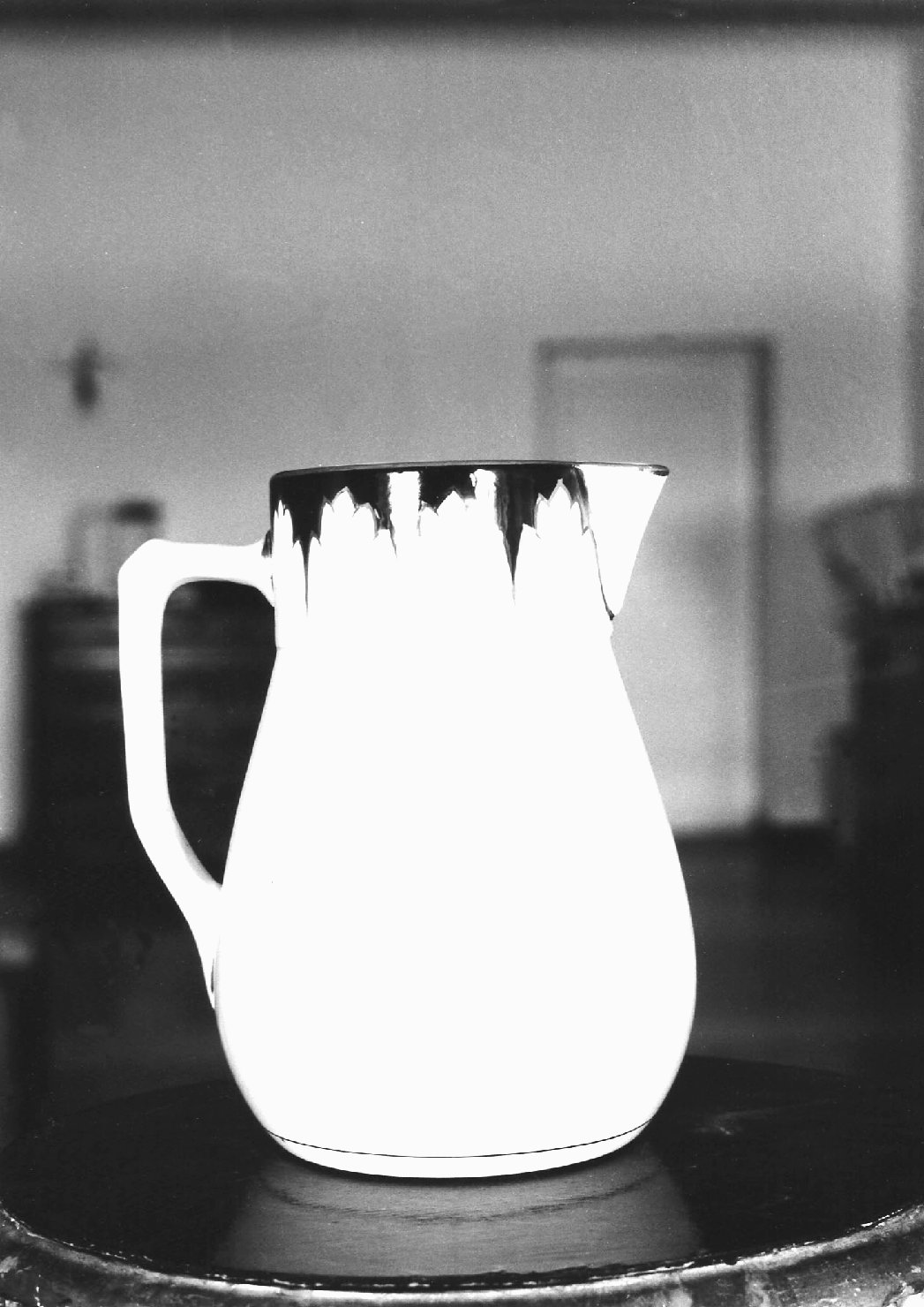 Brocca da toilette di porcellana bianca con decorazioni a motivi irregolar i blu profilati di oro nel bordo superiore