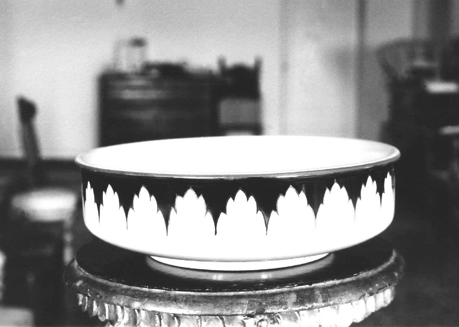 Catino da toilette di porcellana bianca con decorazioni a motivi irregolar i blu profilati di oro nel bordo superiore