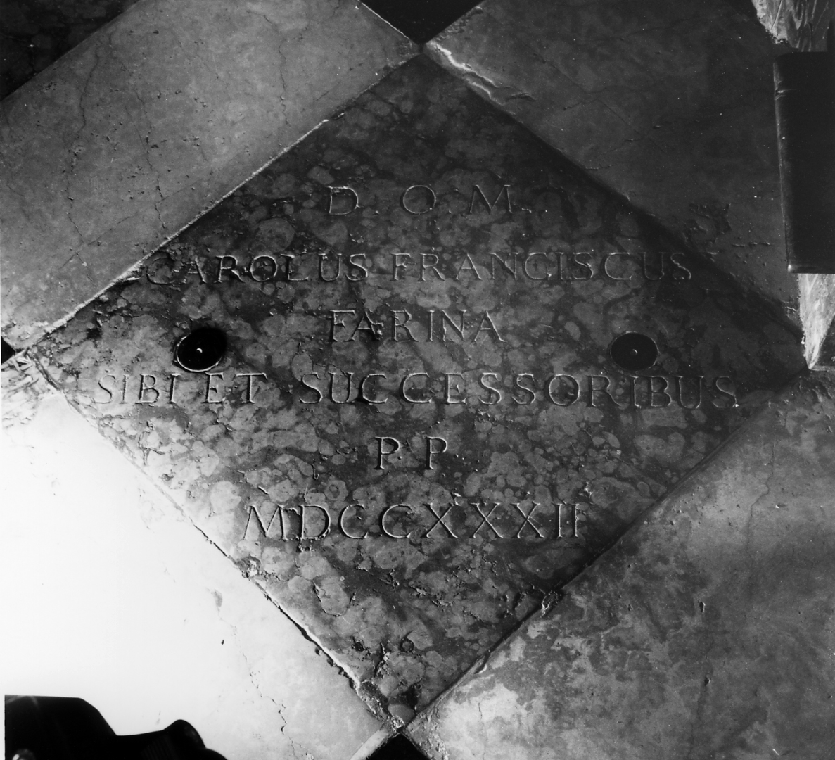 - ISCRIZIONI D.O.M./ CAROLUS FRANCISCUS/ FARINA/ SIBI ET SUCCESSORIBUS/ P.P./ MDCCXXXII - lettere capitali -