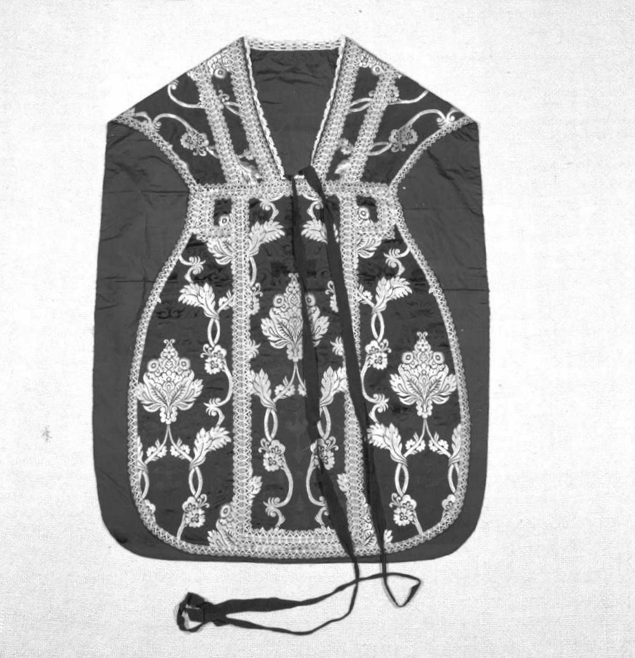 Seta nera broccata oro con decori floreali e passamaneria dorata