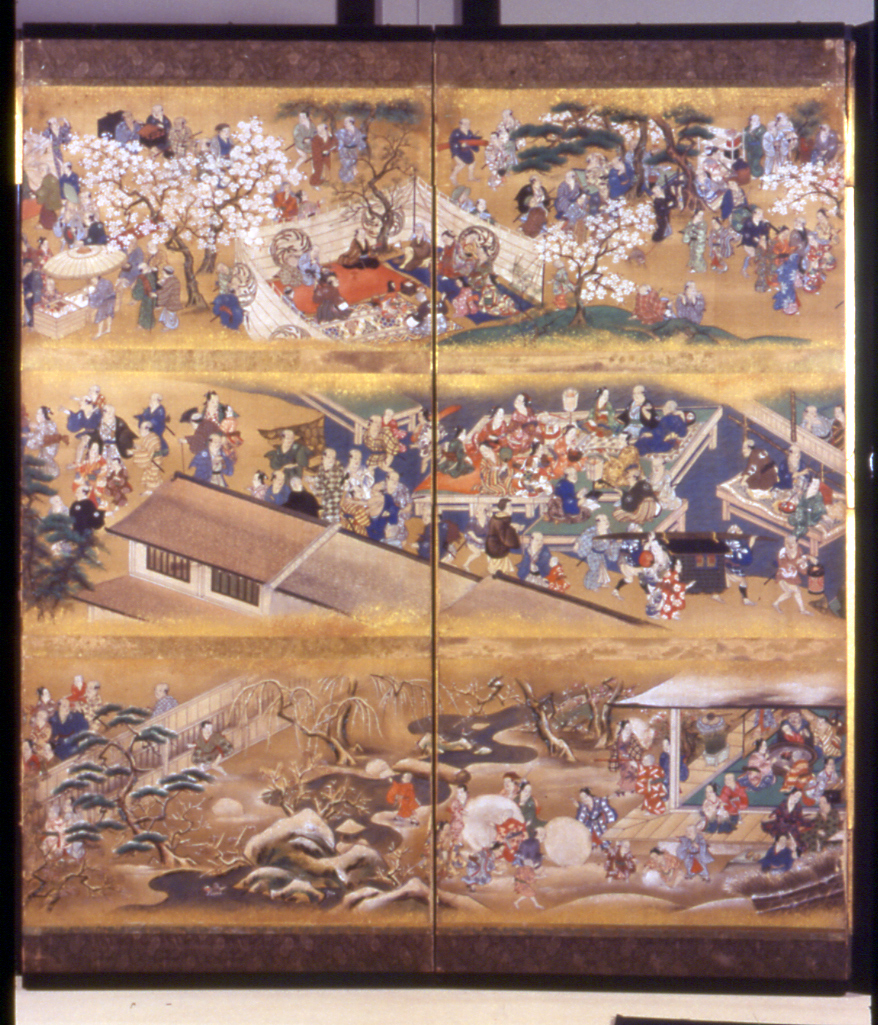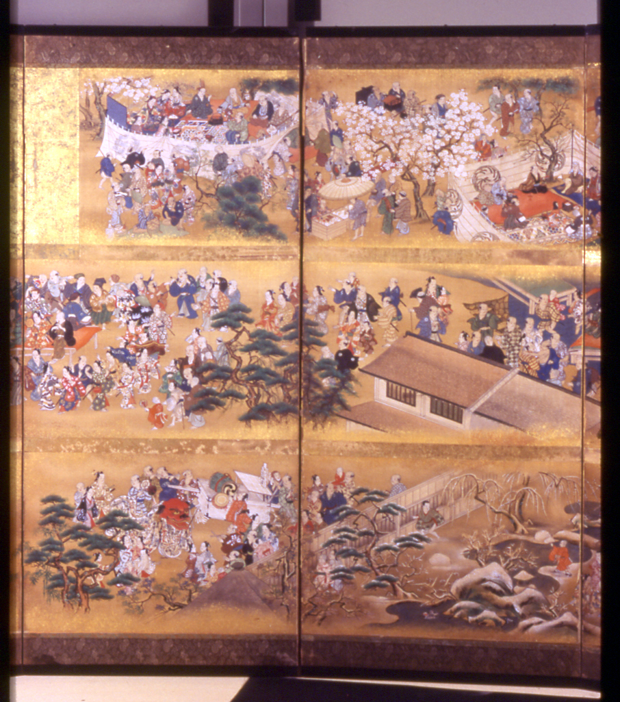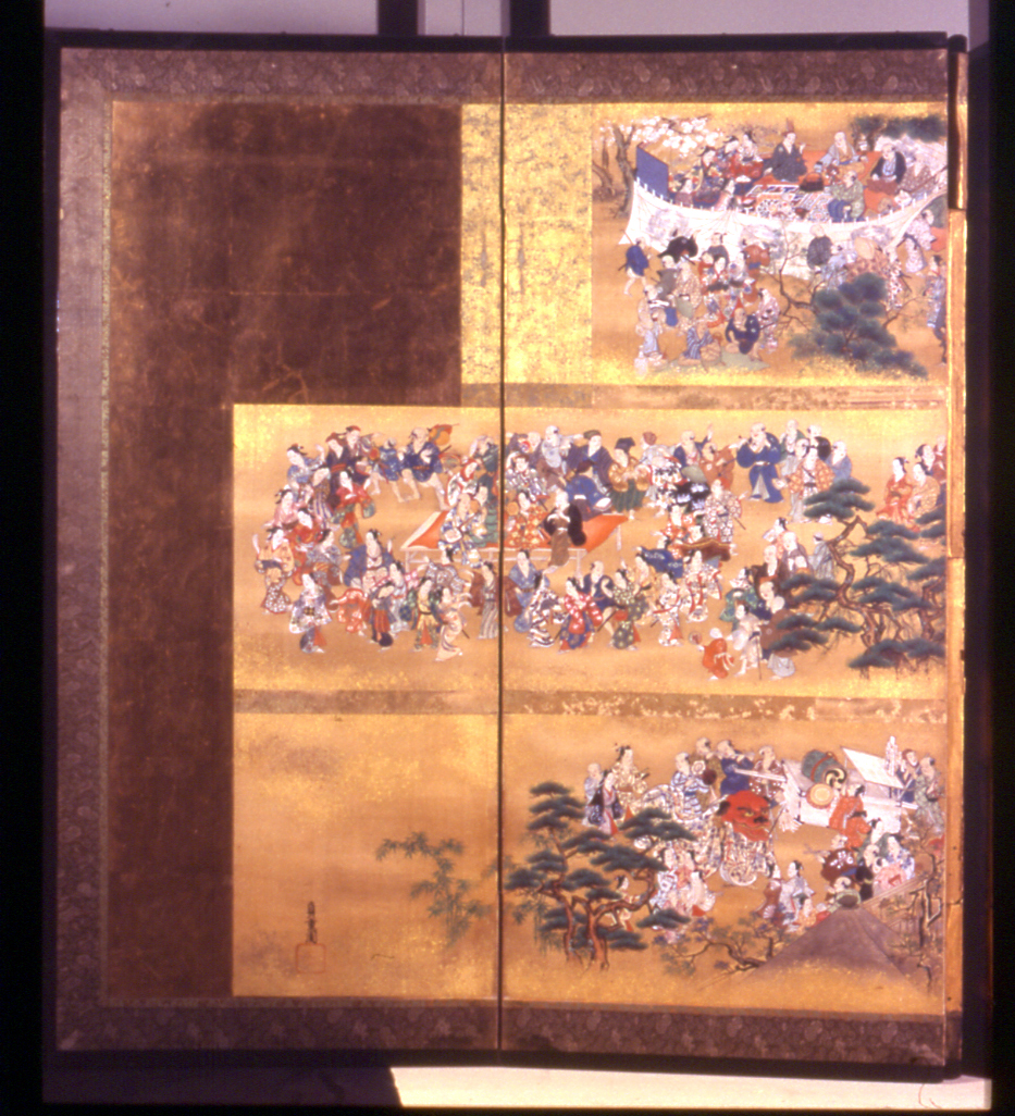 Paravento a sei ante su fondo di carta dorata con foglia d'oro sono applicate 3 strisce di seta disegnata con fuchi in legno laccato nero; kanagu incisi a racemi e oberi in seta damascata verde chiaro con motivo a tralci, gru e losanghe. Verso in carta gessata (?) con motivo suzumegata