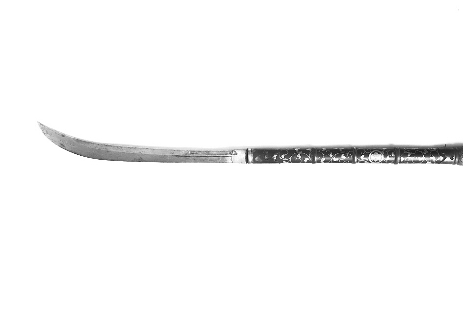 Lancia da parata. Lama di tipo naginata con due solchi per lato; asta ovale interamente laccata nera con racemi di crisantemo in makie e 9 mon (gosan kiri) di cui alcuni racchiusi entro un cerchio e alcuni disposti in verticale; fodero in lacca nera con racemi e 2 mon in makie; coprifodero in tessuto di cotone rosso foderato con seta (?) verde chiara e 2 mon (gosan kiri) in seta (?) avorio applicati esternamente