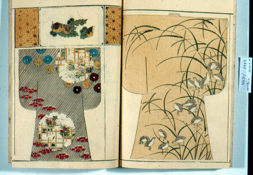 Rilegatura a fukurotoji copertina rigida, che non copre il dorso, di washi stampato a motivi geometrici e stilizzati rosa con mica su fondo beige controguardia in washi 2 rinforzi per gli angoli in tessuto di seta totale di 28 fogli piegati stampe in inchiostro nero e colori per un totale di 68 modelli per kimono e 24 modelli per obi colophon stampato su striscia di washi incollata a sinistra sulla copertina