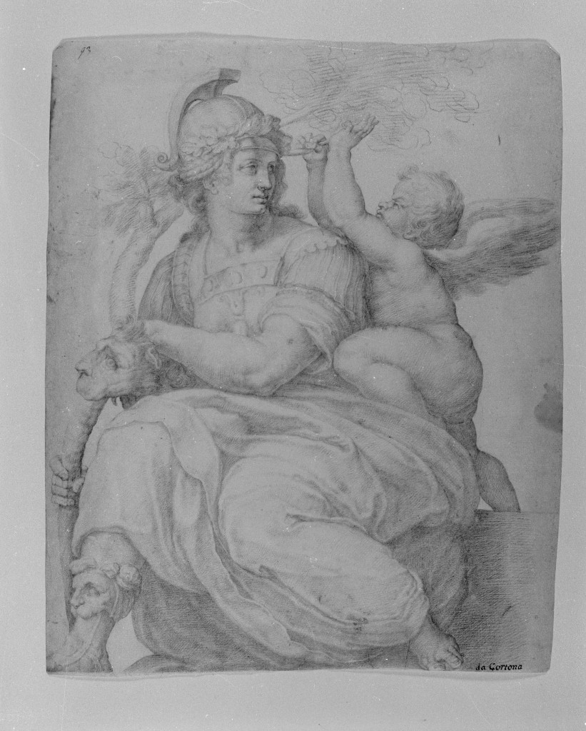 - NOTIZIE STORICO CRITICHE Il foglio copia la figura allegorica della Forza dipinta da Raffaello nella lunetta con le virtù nella Stanza della Segnatura in Vaticano. Assai difficile l'attribuzione del foglio, che l'inventario riferisce a Pietro da Cortona sulla base della scritta antica del tutto insostenibile e per il quale Mario di Giampaolo (nota manoscritta sul passepartout) propone dubitativamente il nome del salviati. Non è da escludere che una copia così elegantemente rifinita possa essere opera di un artista manierista fiorentino