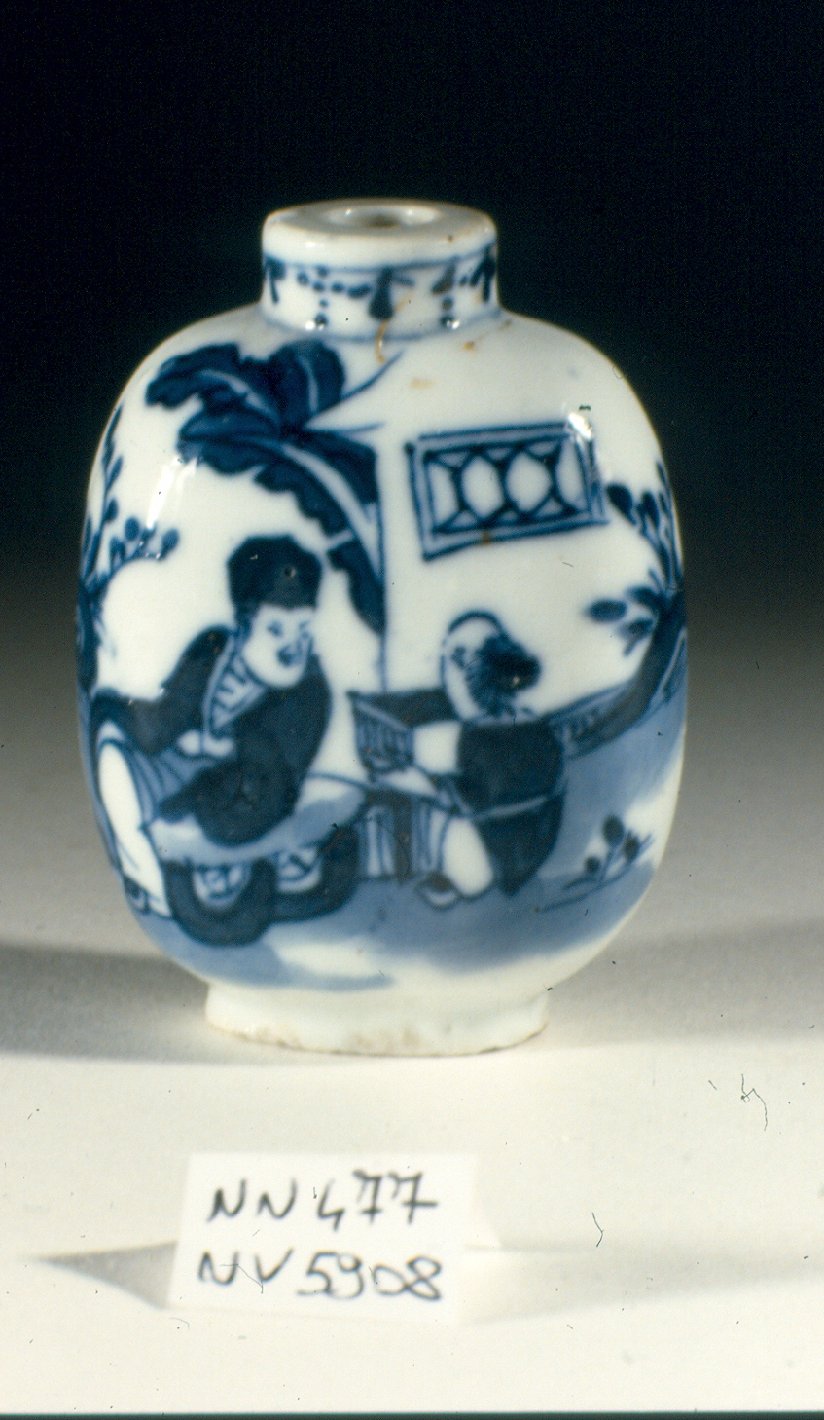 Tabacchiera yanhu dal corpo a sezione ellittica e breve collo. Lieve sbeccatura alla bocca ed alla base. Appartiene alla tipologia dei Bianco e Blu