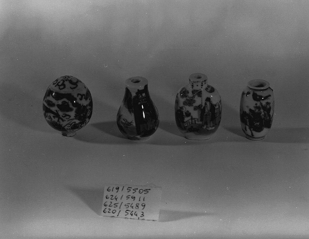 Tabacchiera yanhu dal corpo a sezione ellittica. Sulla base in blu sottocoperta dipinto il marchio: Tongzhi gan nian ("primo anno di Tongzhi", 1862- 1874). Appartiene alla tipologia dei Bianco e Blu
