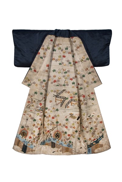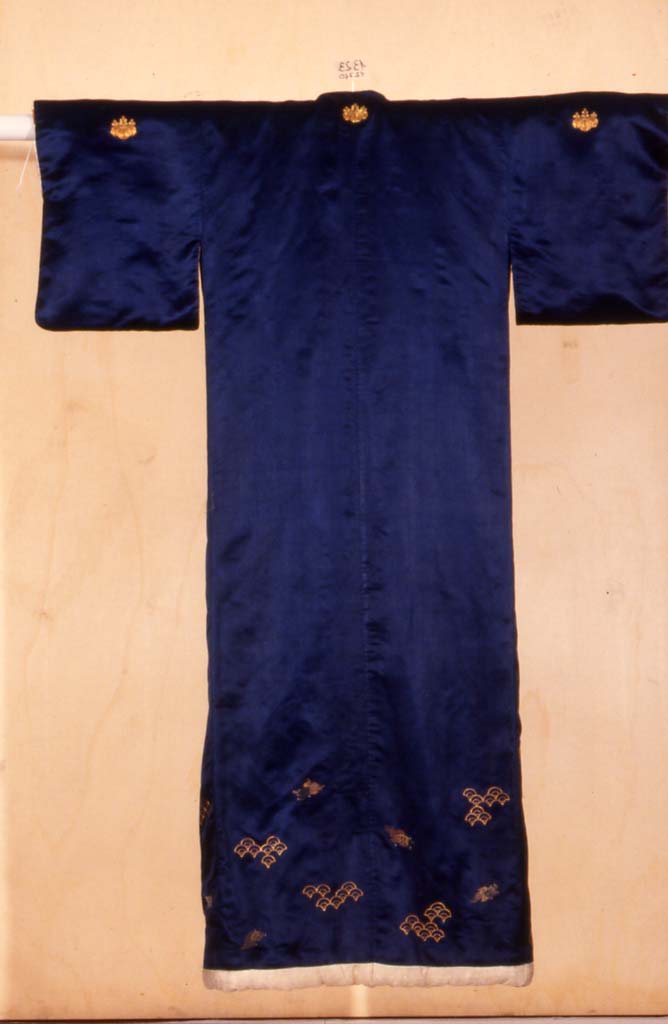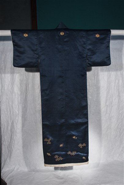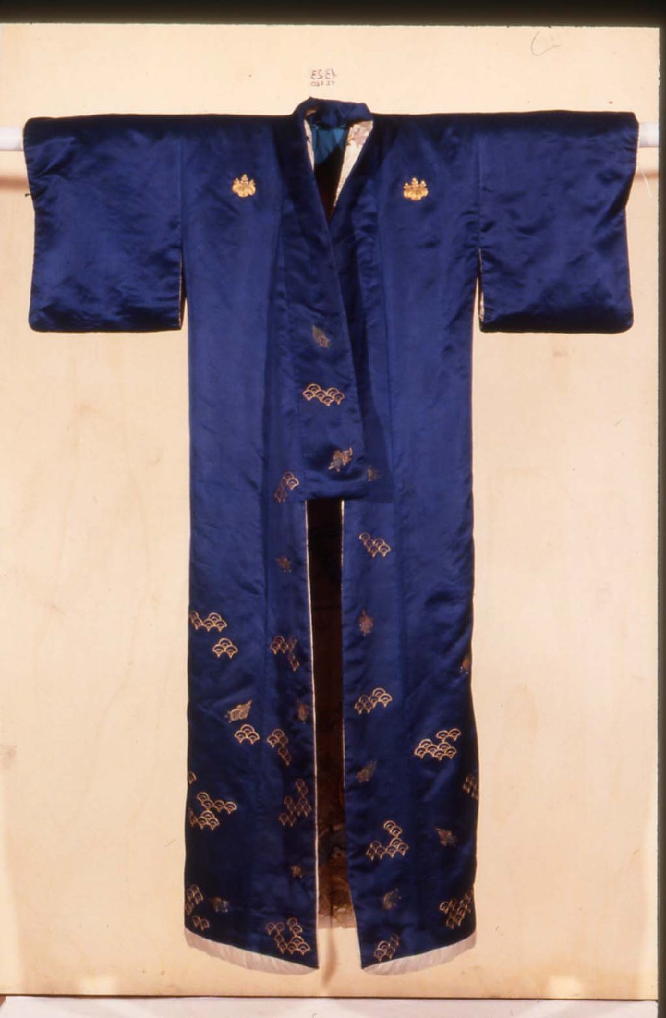 Abito (Kosode) con tessuto doppio. All'esterno: definizione tecnica: raso di seta blu; ricami in oro filato e fili di seta policromi. Costruzione del tessuto: n.1 ordito di fondo, riduzione 80 fili/cm, n.1 trama di fondo, riduzione 40 fili/cm. Armatura: raso da 3 faccia catena, effetto pesante, realizzato dall'ordito blu; saia da 3 effetto trama, diagonale direzione S. Materiali: per il tessuto: filo di seta blu a torsione forte per l'ordito e a torsione media per la trama; decorazione: oro filato su anima di seta bianca, legato al tessuto con filo di seta giallo ocra e bianca; filo di seta avorio, rosa, marrone a lenta torsione; filo di seta ondata verde, rosa con effetti nuances; filo di seta marrone intrecciato con oro filato su anima di seta gialla. All'interno: definizione tecnica: damasco classico di seta bianca, formato da 1 ordito e 1 trama di fondo, tinto e ricamato in fili di seta policromi. Costruzione del tessuto: n. 1 ordito di fondo, riduzione 80 fili cm., 1 trama di fondo, riduzione 40 fili cm. Armatura. raso da 3 faccia catena e faccia trama per i disegni del tessuto. All'esterno: motivo decorativo con tartarughe dalla lunga coda (simbolo di longevità). Interno: motivo decorativo con foglie d'acero (F. Capra). Esterno in raso da 5 faccia ordito, interno in rinzu con disegno effetto trama (E. de Concini)
